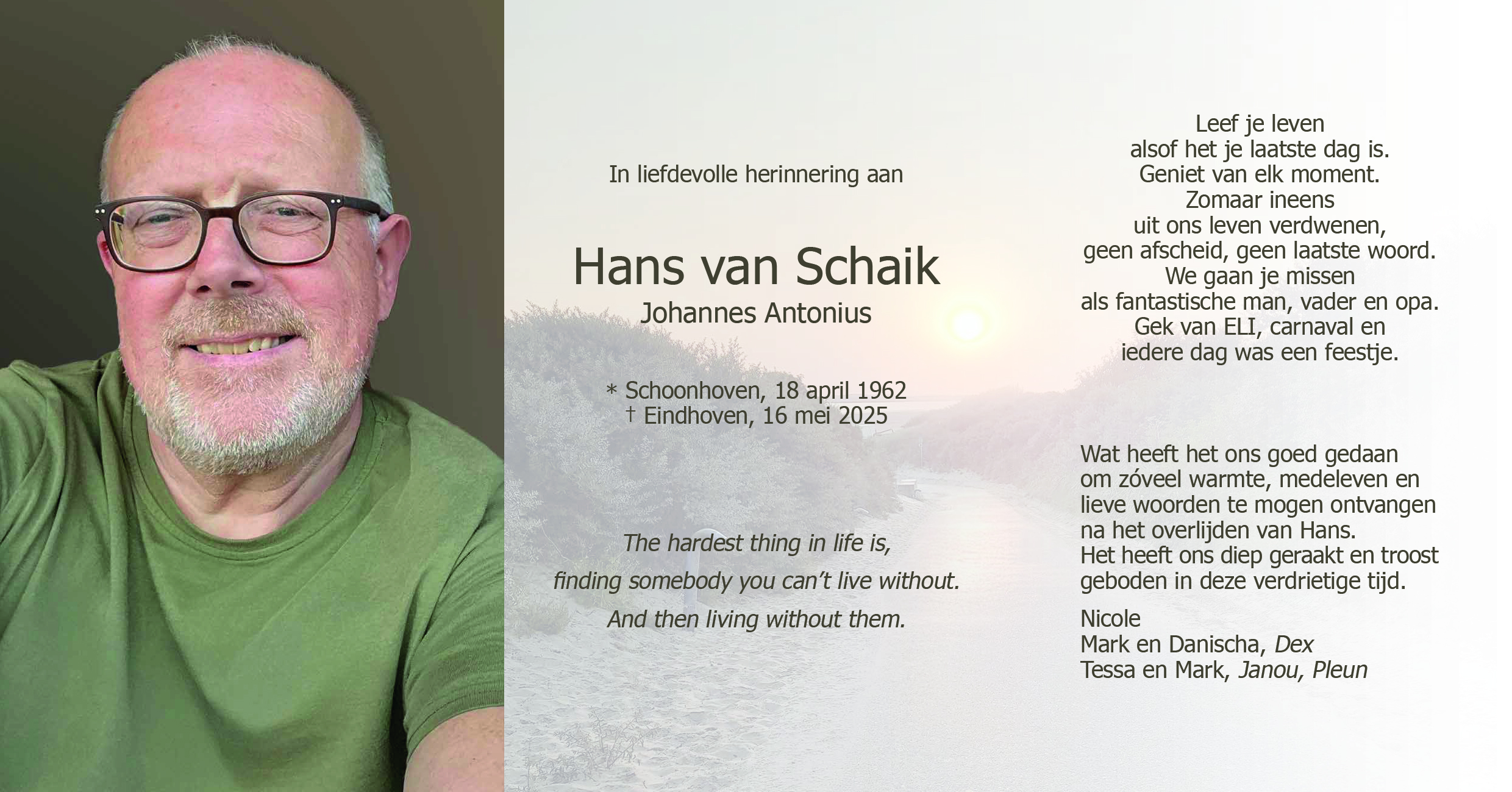 Hans van Schaik Met groot verdriet delen wij via deze weg mee dat Hans van Schaik, de echtgenoot van onze wedstrijdsecretaris Nicole, …